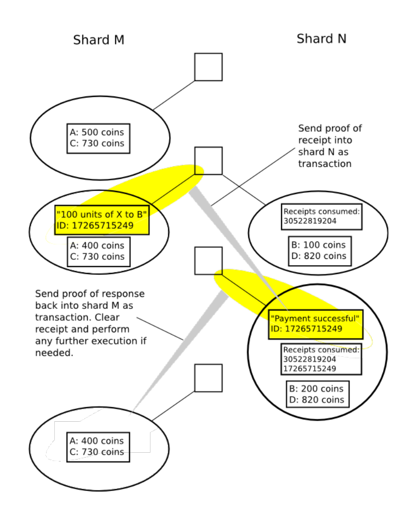 Có nhiều cách khác nhau để thực hiện việc chuyển thông điệp giữa các phân đoạn. Trong Ethereum, cách tiếp cận đang được thực hiện là sử dụng một receipt paradigm (tạm dịch là mô hình biên lai): khi một giao dịch trong phân đoạn thực thi, nó sẽ thay đổi trạng thái của cục bộ nó (local shard), đồng thời tạo ra các biên lai (receipt), được lưu trữ trong một bộ nhớ chia sẻ phân tán nào đó (distributed shared memory), nó có thể được xem (nhưng không được sửa đổi) bởi các phân đoạn khác.