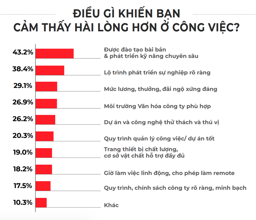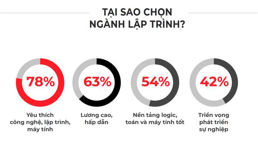 Đa phần các ứng viên chọn theo ngành lập trình vì sự yêu thích và đam mê. Điều họ cảm thấy hài lòng nhất ở một công việc chính là việc được đào tạo bài bản & phát triển kỹ năng. Lộ trình phát triển sự nghiệp và mức lương cũng là 2 yếu tố quan trọng giúp ứng viên cảm thấy hài lòng khi chọn công việc cho mình.