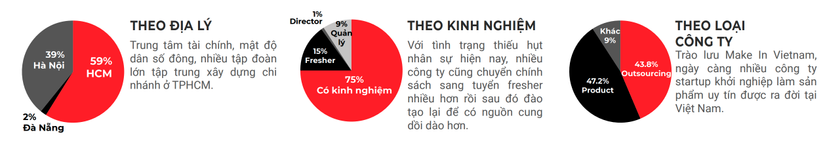 Lượng lập trình viên cấp từ 5 - 10 năm kinh nghiệm chiếm khoảng 33%, trong khi đó lượng lập trình viên dưới 3 năm kinh nghiệm chiếm khoảng 53.5%.