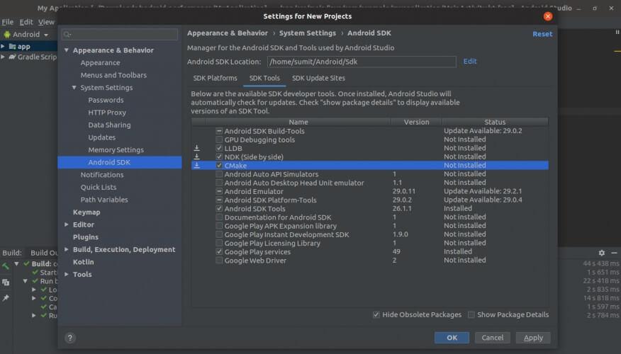 - Chọn LLBD, NDK và CMake.