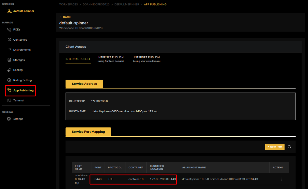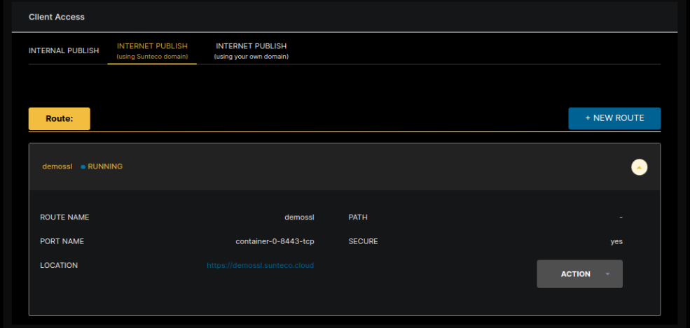 Để publish App ra Internet sử dụng domain của Sunteco, chọn Internet Publish (using Sunteco domain) và nhấn New Route: