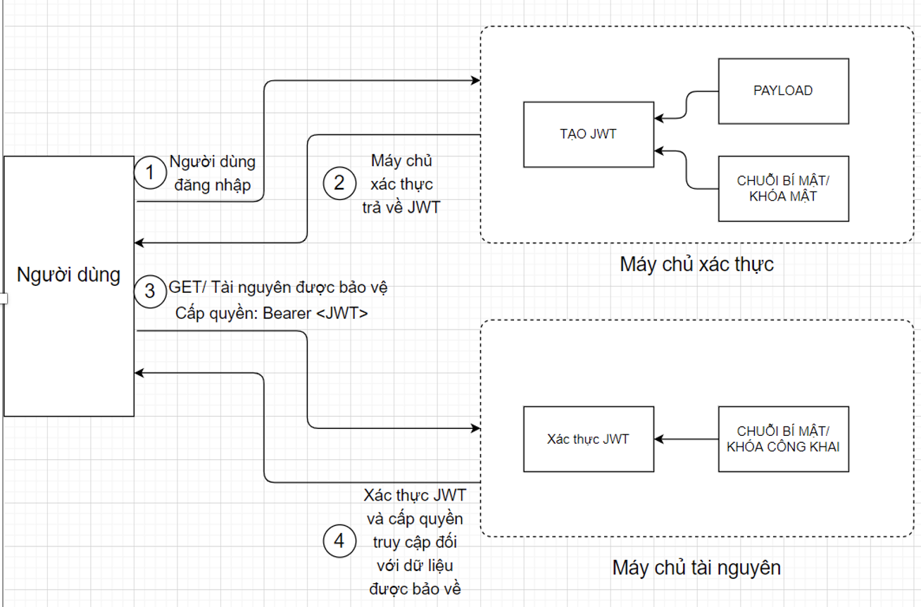 Về cơ bản, các nhà cung cấp danh tính (identity provider - IdP) tạo JWT xác nhận danh tính người dùng và máy chủ tài nguyên (Resource server) sẽ giải mã và xác minh tính xác thực của token bằng cách sử dụng chuỗi bí mật hoặc khóa công khai: