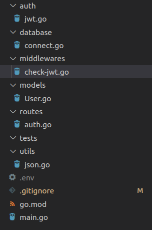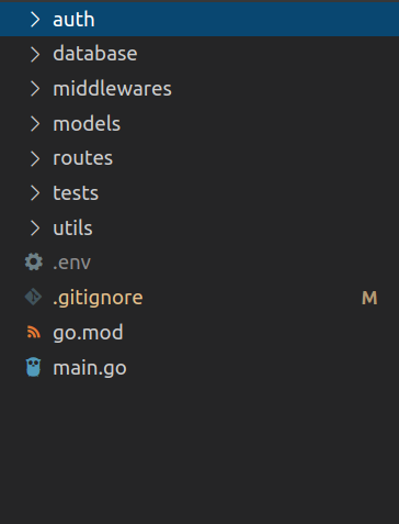 go.modquản lý cách package (như đã giới thiệu ở trên ). .envlưu các biến môi trường của ứng dụng -authchứa file xử lý json web tokendatabasechứa các file có nhiệm vụ thao tác với MongoDB (connect cơ sở dữ liệu ).modelsđịnh nghĩa là cấu trúc dữ liệu sẽ được lưu vào collection.routeschứa các hàm xử lý request ứng với từng routetestschứa các file unit testutilschứa một số hàm xử lý cần dùng (parse JSON, ...)