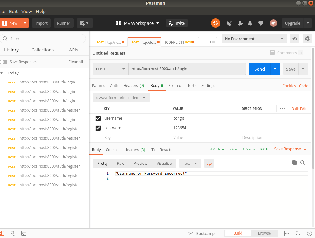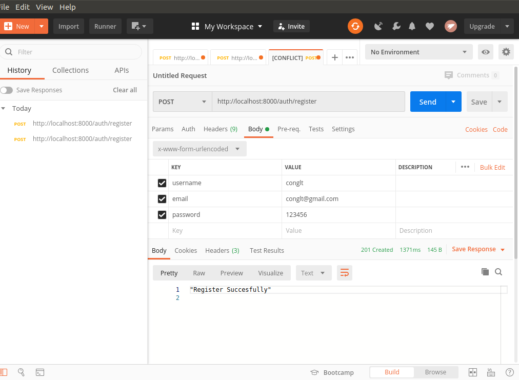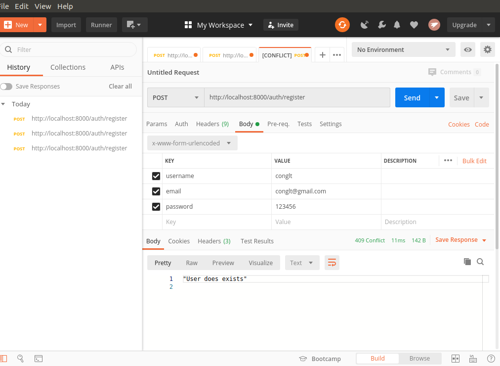 - Đăng ký thất bại do trùng thông tin (trả về status 409)