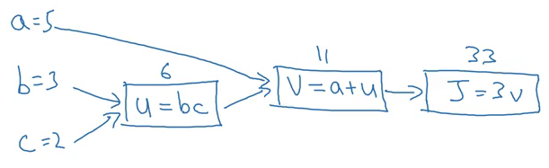 Đây chính là lan truyền về phía trước (forward propagation) để cho ra output J. Chúng ta cũng sẽ sử dụng chính biểu đồ này để thực hiện làn truyền ngược (backward propagation) hay chính là bược tính đạo hàm để cập nhật các trọng số a, b, c.