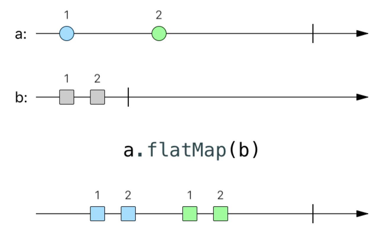 Hãy tưởng tượng một Observable Sequence chứa những objects mà bản thân những objects đó là Observable và bạn muốn tạo một Sequence từ những cái đó. Đây là lúc sử dụng FlatMap. FlatMap sẽ gộp những phần tử được phát từ những Observable và biến thành một Sequence