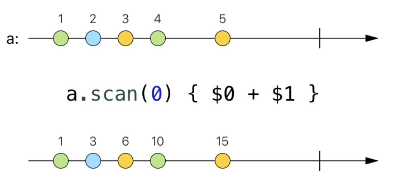 Scan bắt đầu với một giá trị khởi tạo và được kết hợp lại những giá trị giống với reduce trong Swift