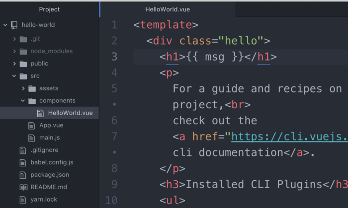 Trong ứng dụng đã tạo, một chuỗi được chuyển qua msg = "" prop của <HelloWorld /> component trên dòng 4 của src/App.vue:
