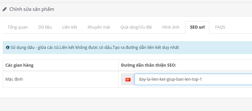 Sau khi làm xong bước 1 thì về cơ bản website của bạn đã được kích hoạt tính năng SEO, mỗi khi thêm bài viết mới hay một sản phẩm mới thì trong admin phần nhập liệu sẽ có mục để bạn tùy chỉnh liên kết của tài nguyên. Tuy nhiên, để người dùng có thể truy cập được liên kết đó thì bạn cần phải edit lại file htaccess (hiện tại trên nginx thì mình vẫn chưa biết cái file cấu hình chuẩn là gì, a/c/e nào biết share mình với nhé) như sau: