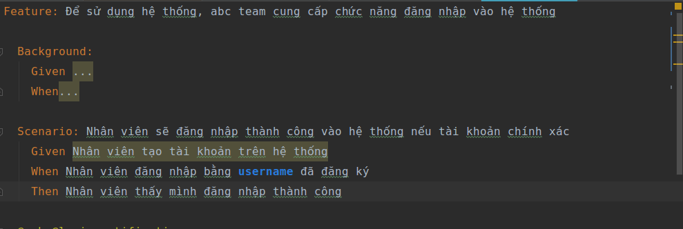 Scenario: Từ khóa bắt đầu trước mỗi kịch bản, tiếp theo là tiêu đề của kịch bản sẽ thực hiện Mỗi kịch bản bao gồm một hoặc nhiều bước