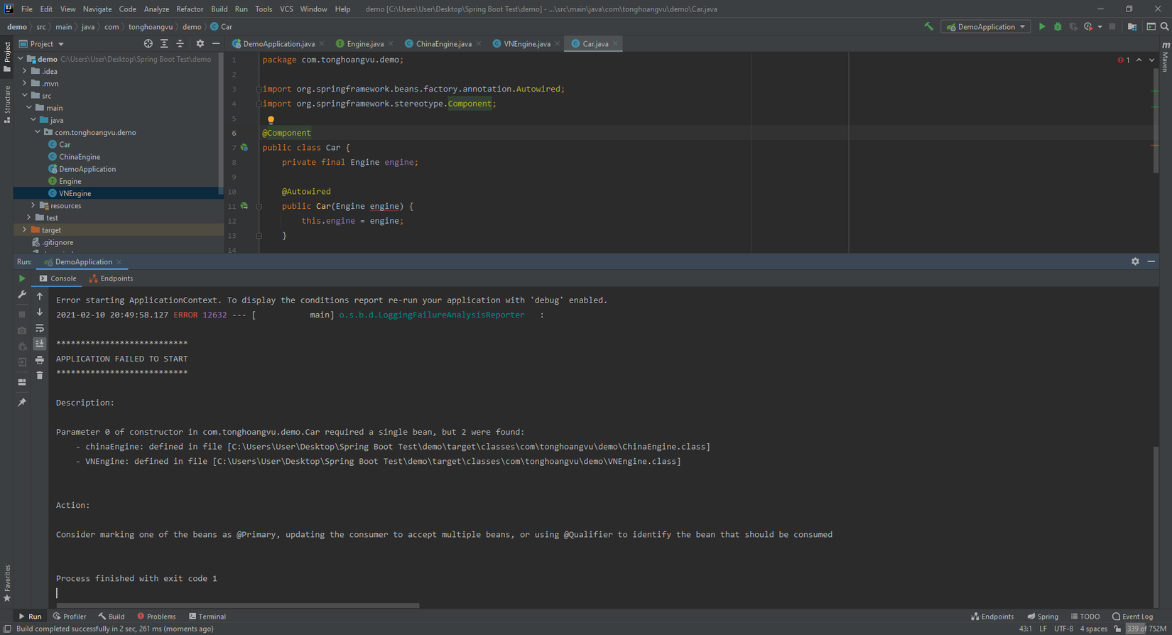 Có thể hiểu do Spring Boot đã tìm thấy hai bean phù hợp để inject vào Car. Do cả hai VNEngine và ChinaEngine đều implements Engine, mà Car cần Engine nên không biết nên chọn cái nào.