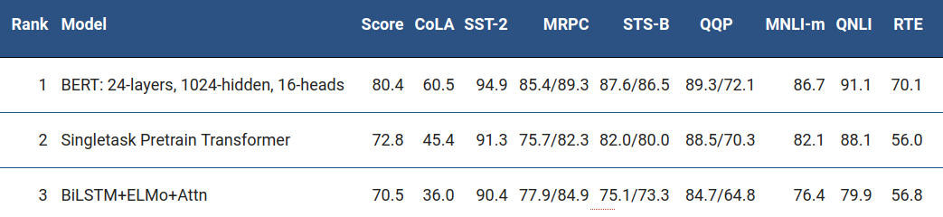 BERT cũng cải thiện được hiệu năng tốt nhất trong thách thức GLUE benchmark, một bộ 9 nhiệm vụ Natural Language Understanding (NLU).