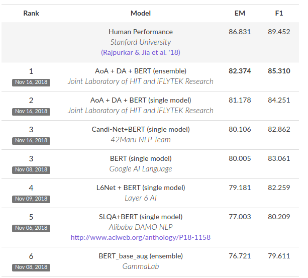 Trên SQUAD v2.0, Top 6 kết quả tốt nhất hiện giờ toàn bộ là của BERT.