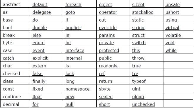 Dưới dây là danh sách các từ khóa trong C#, các bạn chỉ cần nắm để tránh đặt tên trùng với từ khóa còn việc mặt ý nghĩa từ khóa sẽ được trình bày trong suốt các bài học sau này.