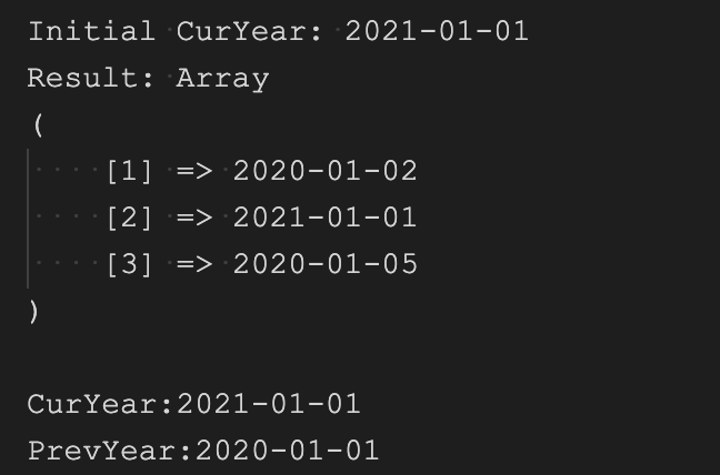 $db = [ '2021-01-02', '2020-01-02', '2021-01-01', '2020-01-05', '2019-01-05' ]; -