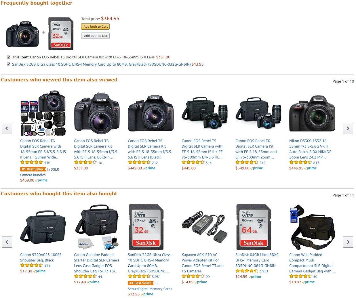 - Nếu bạn mởi 1 trang sản phẩm, bạn có thể nhìn thấy action này ở dưới : “Frequently bought together”, “Customers who bought this item also bought” and “Customers who viewed this item also viewed”. Các thông tin này được sử dụng để recommend deals / discounts và xếp hạng sản phẩm trong kết quả tìm kiếm