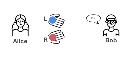 - Alice sẽ quy ước với Bob về số hiệu của 2 quả bóng (quả bên tay trái là quả số 1, quả bên tay phải là quả số 2 chẳng hạn).