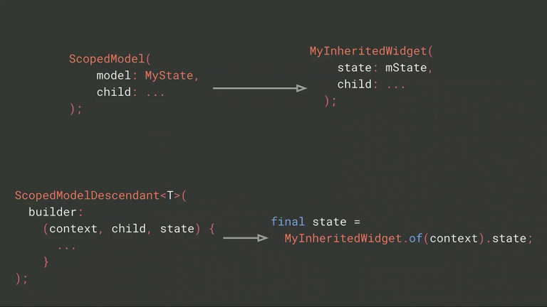 Scoped Model là một third party package được cung cấp và maintain bởi Brain Egan. Nó được xây dựng dựa trên InheritedWidget và cung cấp cách truy cập, cập nhật và thay đổi trạng thái tốt hơn. Nó cho phép bạn dễ dàng truyền một data model từ parent widget xuống các widget con cháu của nó và build lại tất cả những childrent widget có sử dụng model. Để kiểm tra có bất kỳ thay đổi nào, phương thức listeners() được sử dụng bởi Scoped Model