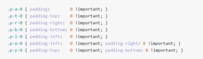 Cú pháp cho các classes mới khá đơn giản, ví dụ: thêm class .m-a-0 liên kết một quy tắc kiểu đặt margin thành 0 trên tất cả các mặt của phần tử đã cho (margin-all-0). Trong khi margin sử dụng tiền tố m-prefix, padding được tạo kiểu với tiền tố p-prefix.