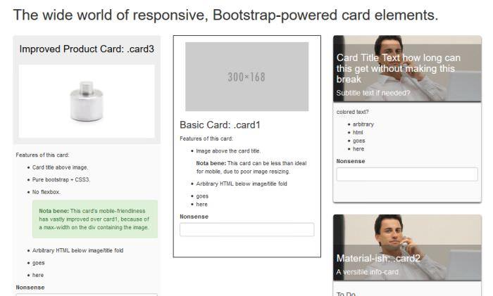 Nhóm phát triển đã quyết định hợp nhất một số yếu tố trước đây của giao diện người dùng Bootstrap, vì vậy họ quyết định giới thiệu một thành phần UI mới có tên là Cards. Cards sẽ thay thế các wells, thumbnails, panels trước đây và sẽ cung cấp cho người dùng quy trình làm việc hợp lý hơn. Đừng lo lắng, cards sẽ giữ các yếu tố quen thuộc, chẳng hạn như titles, headers và footers của wells, thumbnails và panels.