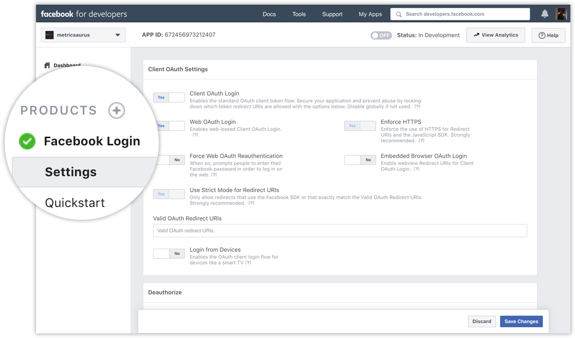 Valid OAuth Redirect URIs(Chắc ae làm facebook login nhiều rồi thì biết, còn ai chưa biết thì mình sẽ làm 1 bài chia sẻ sau nhé) Facebook Loginlà điều kiện bắt buộc để bạn có truy cập các tài nguyên của facebook , đây là bước đệm cho những bước tiếp theo