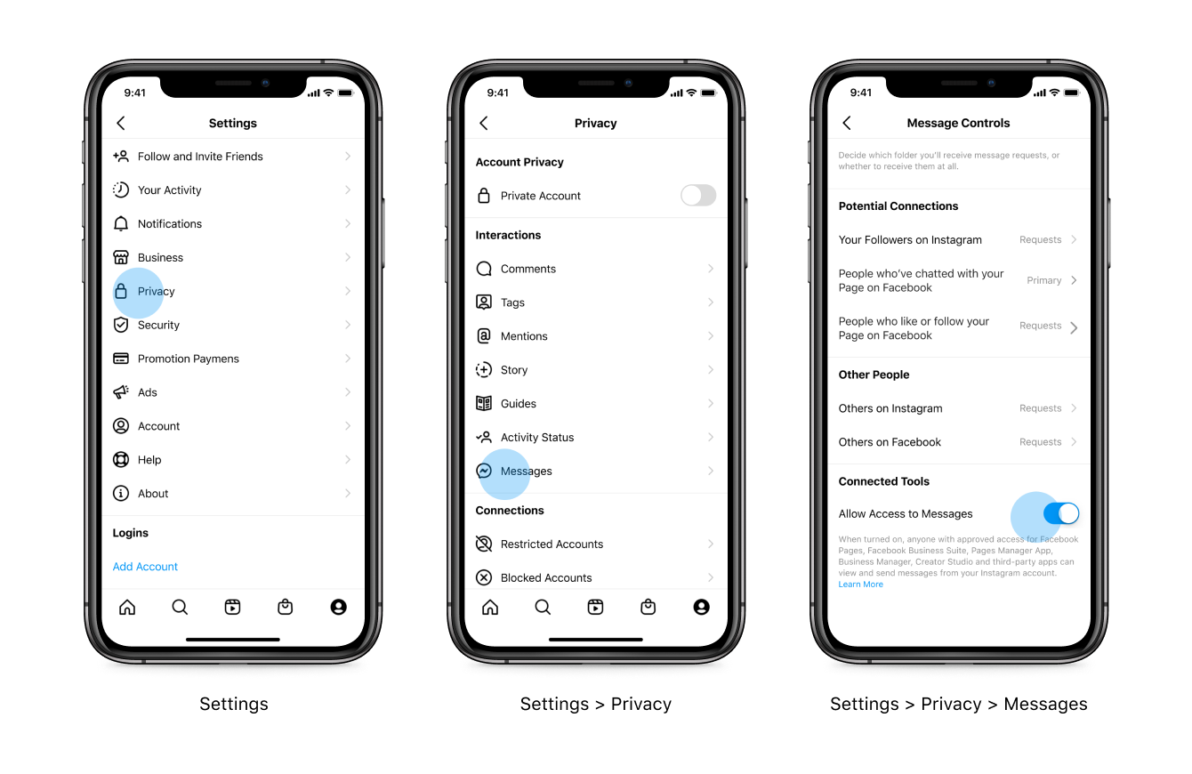 Để quản lý message của Instagram qua API, tài khoản Instagram Business Account sẽ cần bật chuyển đổi các công cụ được kết nối trong cài đặt control tin nhắn.