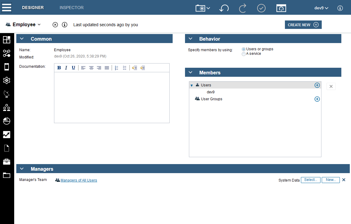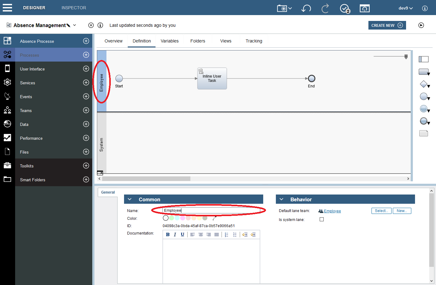 Dựa vào yêu cầu của process, bạn phải tạo team cho mỗi một vai trò của user: Employee, Manager. Để mô hình hóa team, bạn thêm lane và assign team cho lane đó. Mỗi lane chứa activities thể hiện một thao tác/ thi hành của team hoặc hệ thống (system). Khi bạn tạo Process, Process Designer tạo ra 2 lane mặc định: Team và System. Với Absence Process, bạn phải tạo lane và team như sau: (Đây chỉ là quy trình demo nên ta sẽ sử dụng chính user đang thực hiện develop để gán cho team)