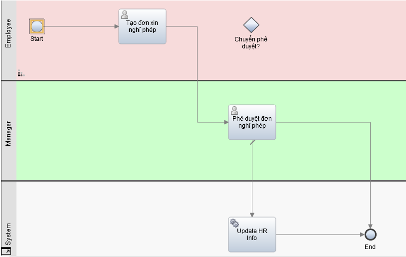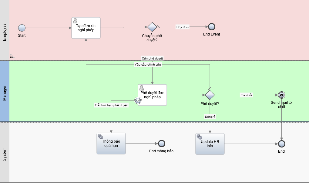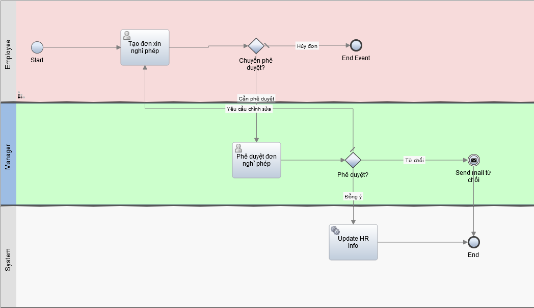 - Phê duyệt ?: Có ba trường hợp xảy ra: Nếu như Manager đồng ý duyệt, luồng sẽ đi tới thông báo cho HR, và trừ ngày phép. Nếu không đồng ý thì luồng sẽ email thông báo cho nhân viên. Nếu yêu cầu chỉnh sửa thì luồng sẽ trở lại Tạo đơn xin nghỉ phép.