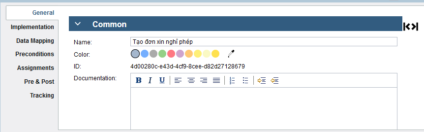 | Employee | Tạo đơn xin nghỉ phép. Màu Red. User sẽ điền vào form và tạo một đơn xin nghỉ phép | Start |