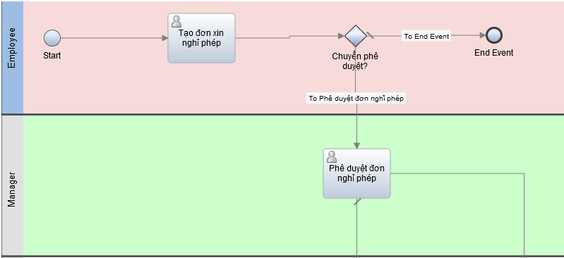 - Kéo thả từ thanh Palette một End Event, nối gateway Chuyển phê duyệt? với End Event, tiếp tục nối gateway này với Phê duyệt đơn xin nghỉ phép.