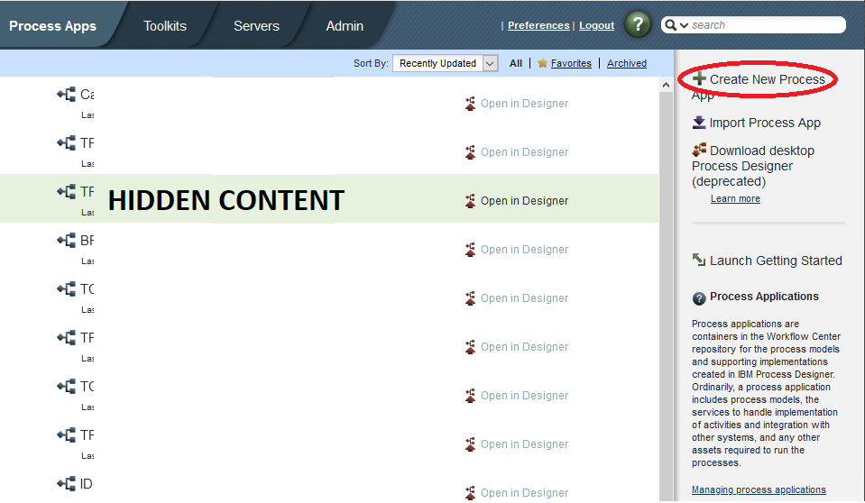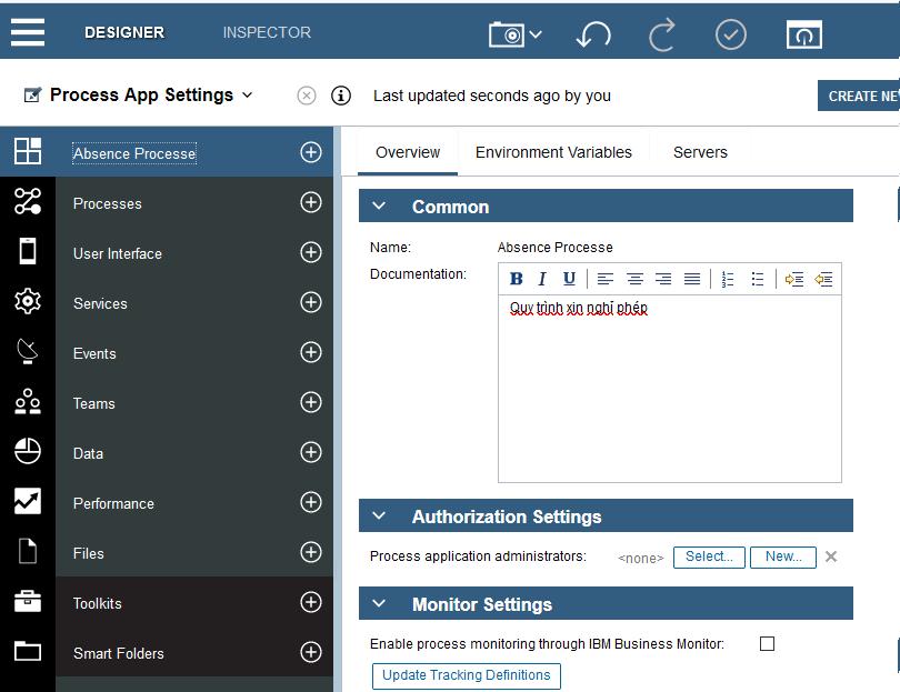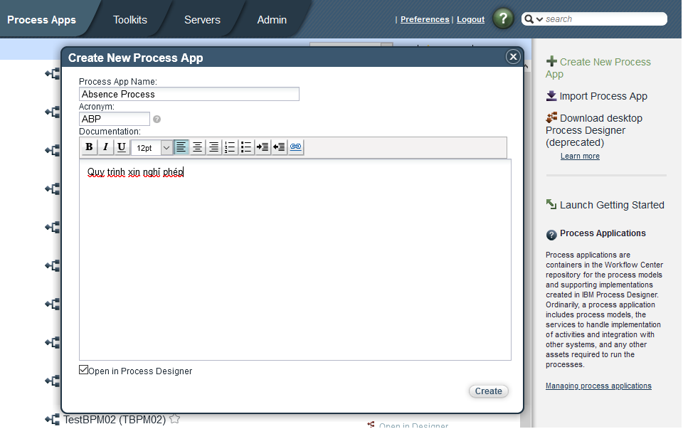 Đầu tiên bạn phải tạo Process application trước khi bạn có thể làm bất cứ điều gì, Process Application được lưu trên Process Center repository.