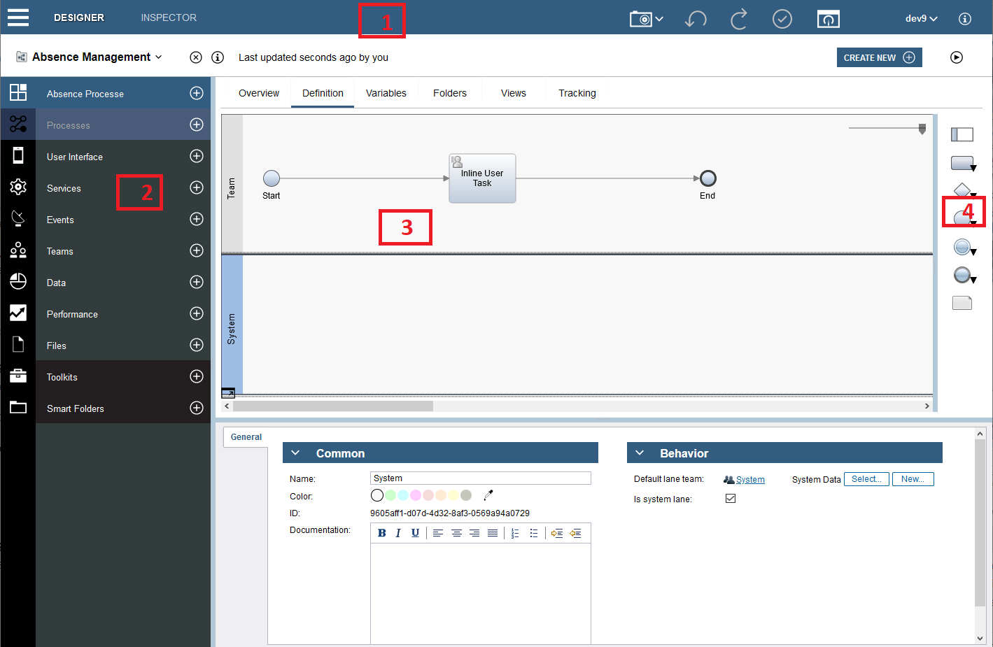 | 3 | Main canvas | Khu vực bạn có thể mình họa process. Mỗi process được khởi tạo tự động có một start event và end event. Hai lane mặc định bao gồm một cho user và một cho system |