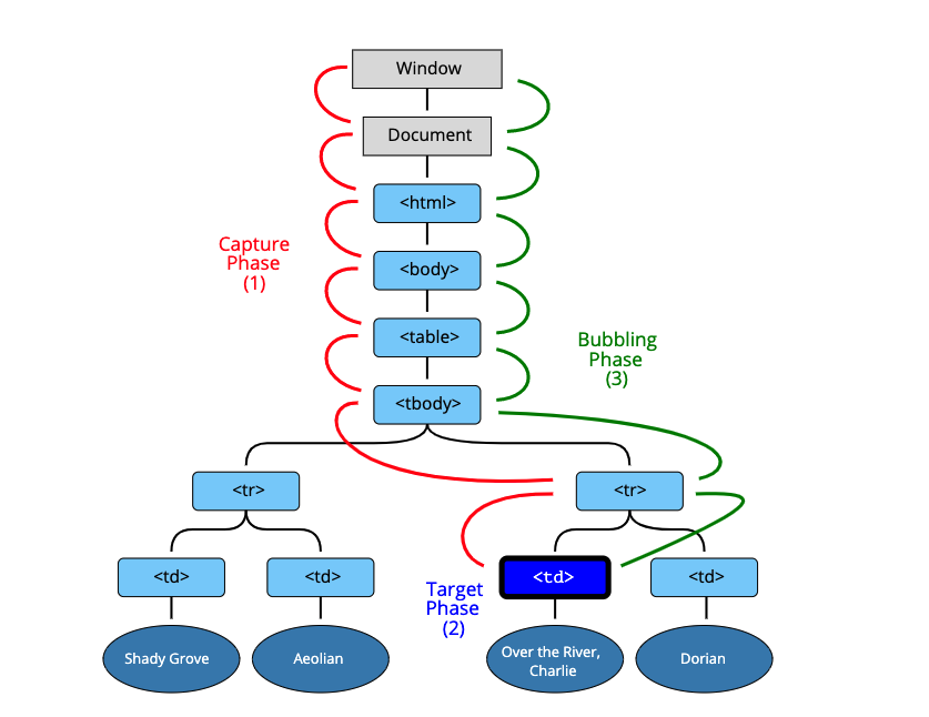 eventđạt tới phần tửtarget element - Bubbling phase: Giai đoạn đi lên từ