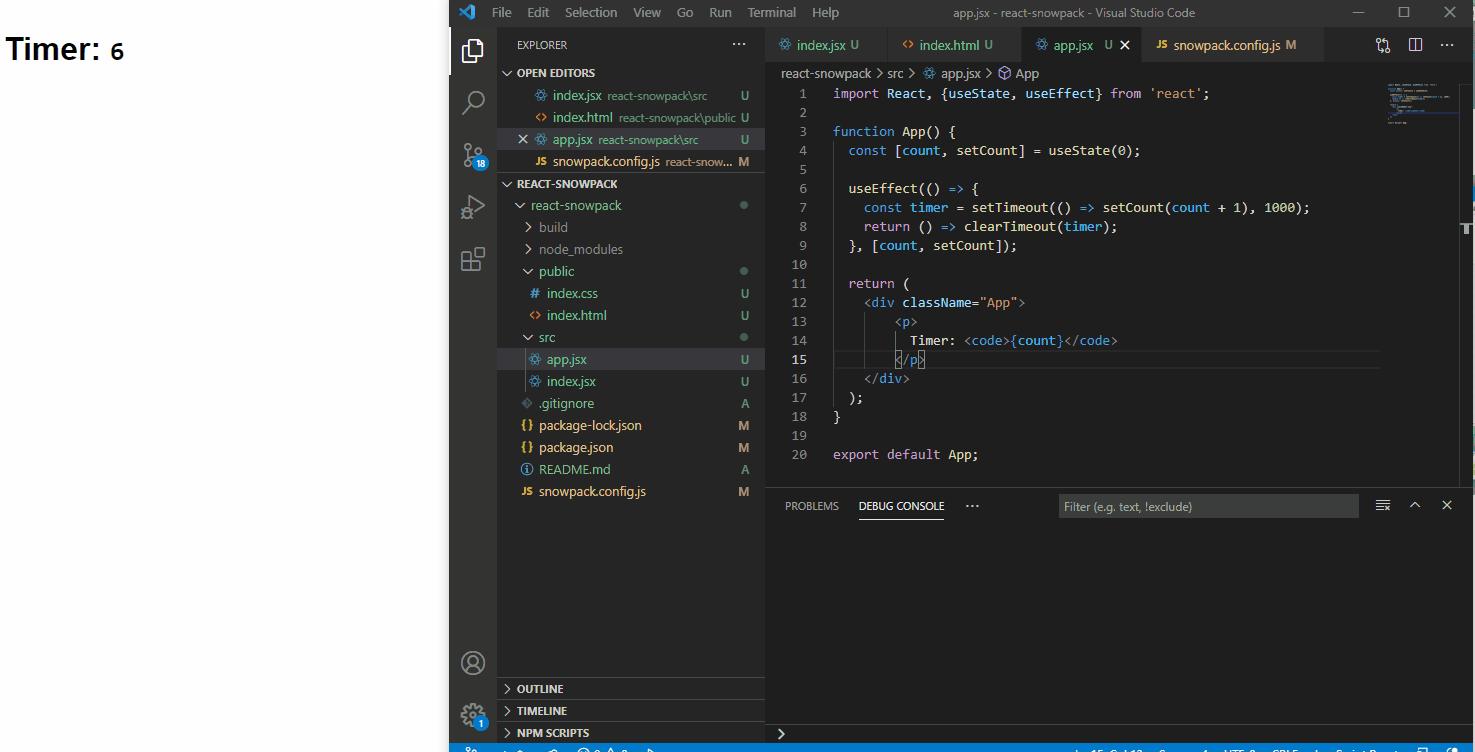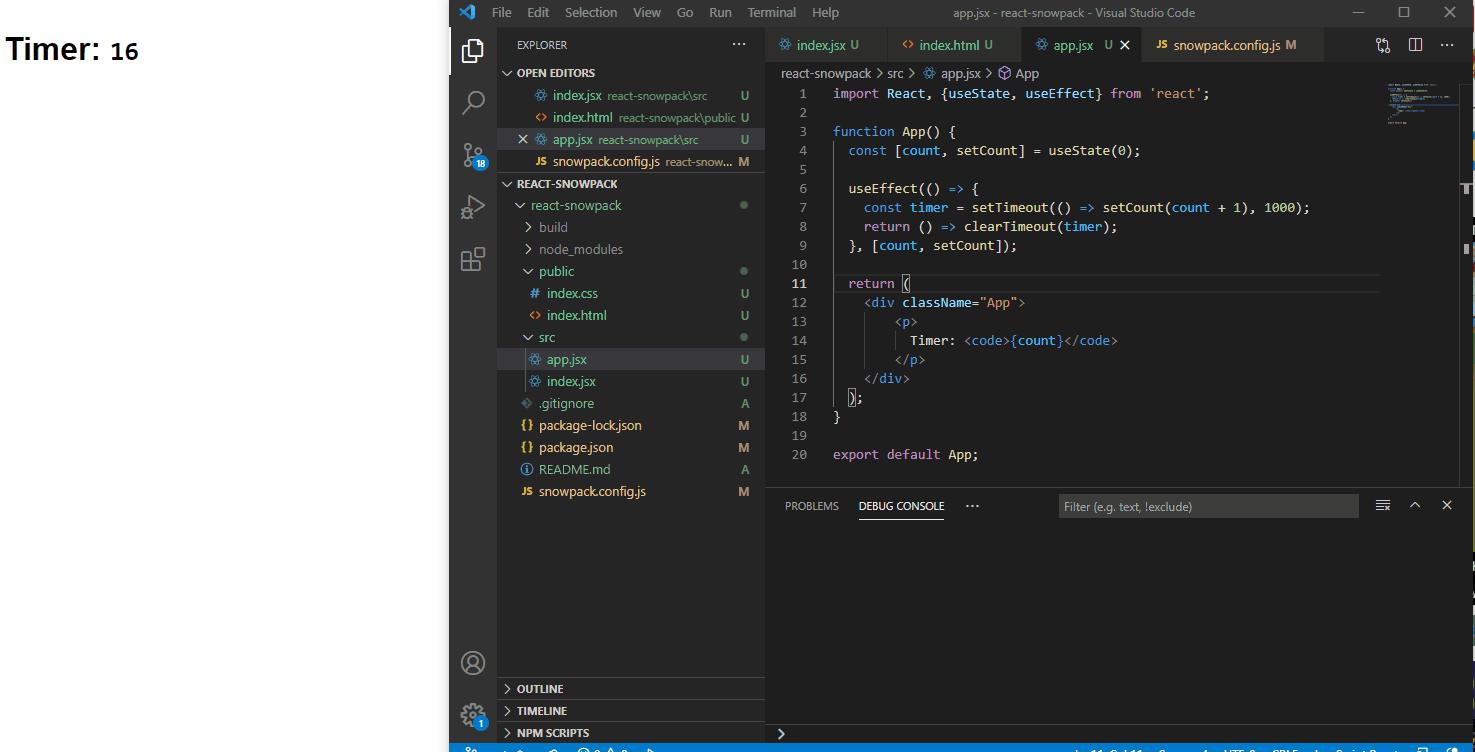 Khi làm việc với react thì khái niệm về jsx đã quá quen thuộc với chúng ta rồi. Snowpack đã tích hợp hỗ trợ jsx với các file có đuôi là .jsx. Chúng ta không cần phải cấu hình, hay cần phải cài thêm plugin nào để viết react component. Sau đó chúng ta vào thư mục dự án chỉnh sửa lại file index.js thành index.jsx