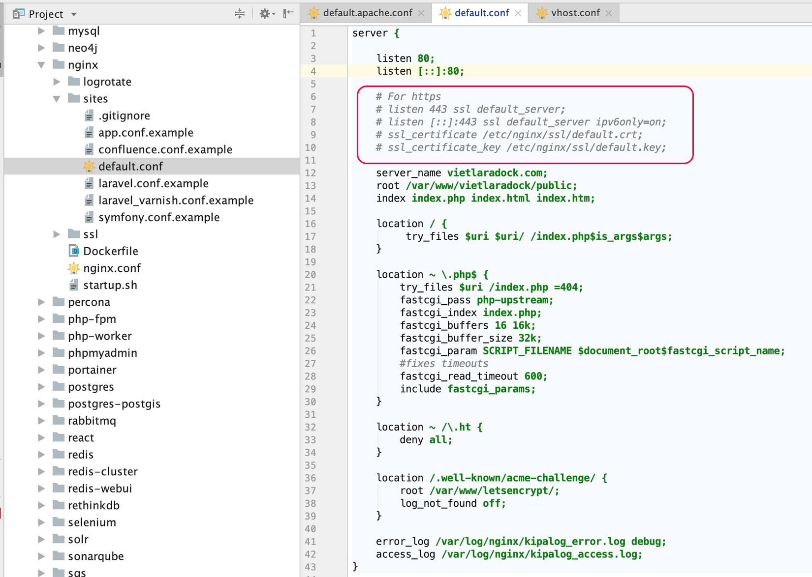 2 file sau khi tạo xong vietlaradock.local.key và vietlaradock.local.crt Bạn để em nó ở đâu thì lấy địa chỉ chỗ ở hiện tại và ghi lại vào file nginx/default.conf này nhé :