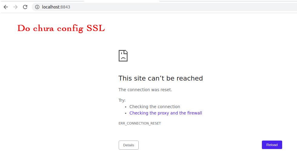 Nhưng khi thay đổi đường dần thành : https://localhost:8843 thì lúc này lại ra kết quả như hình dưới. Nghĩa là nó không thể kết nối tới địa chỉ này được.