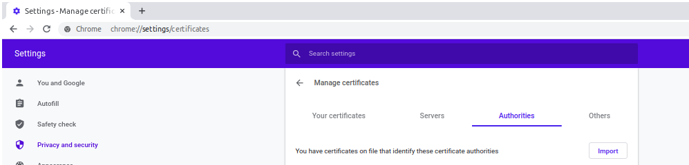 Đối với Chrome, các bạn vào Setting > Security > Manage certificate => chọn tab Authorities. Import file localca.pem trong folder localca phía trên, chọn Trust this certificate for identifying websites