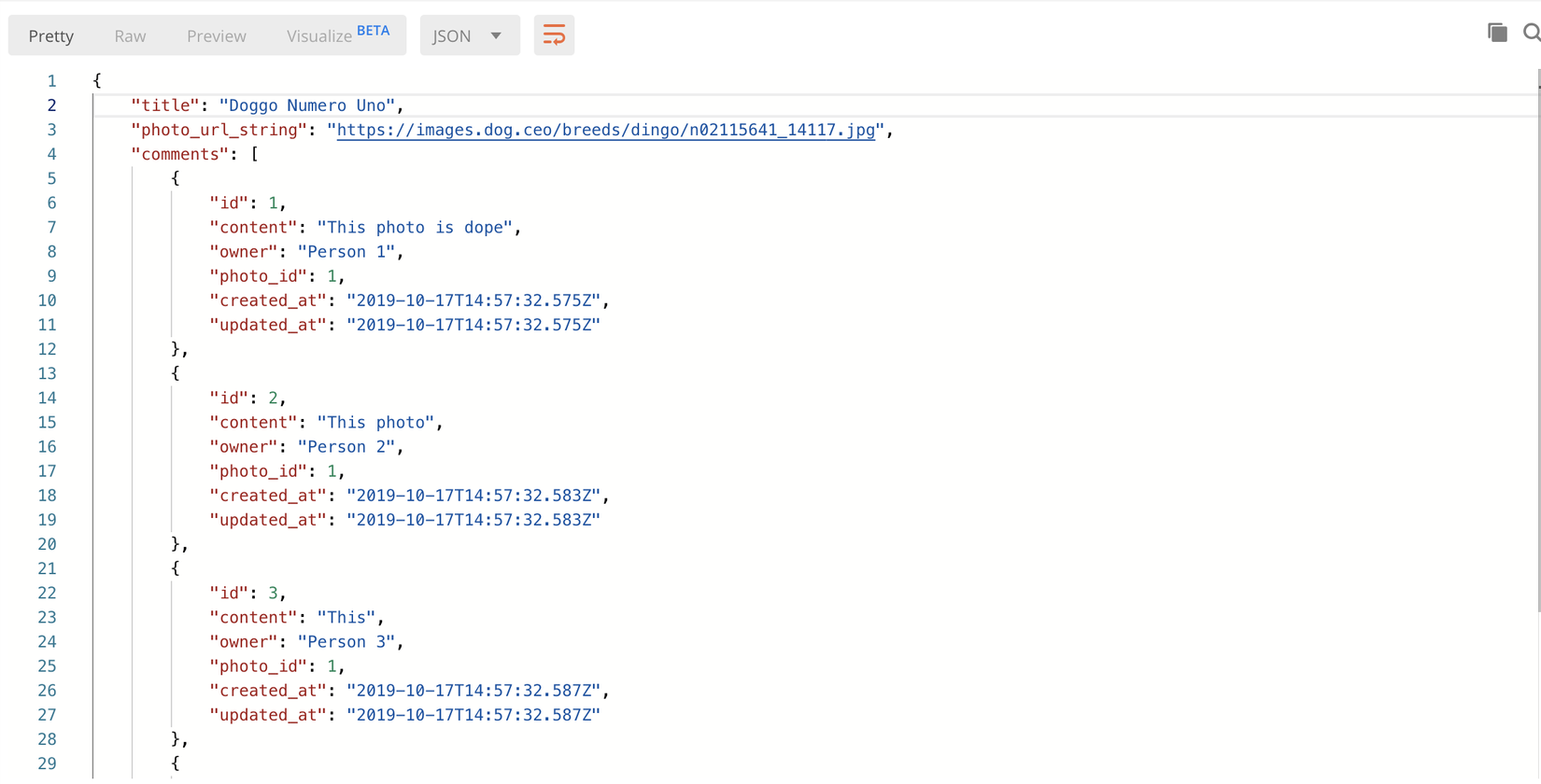 Khi đó, với request: http://localhost:3000/api/v1/photos/1 thì JSON response đã được include các comments tương ứng: