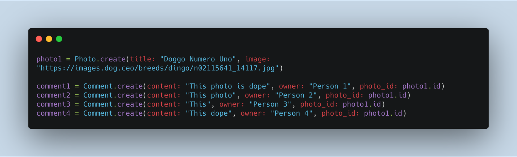 Các attributes của một Photo sẽ là title và photo_url_string. Còn attributes của comments là content, owner và photo_id.