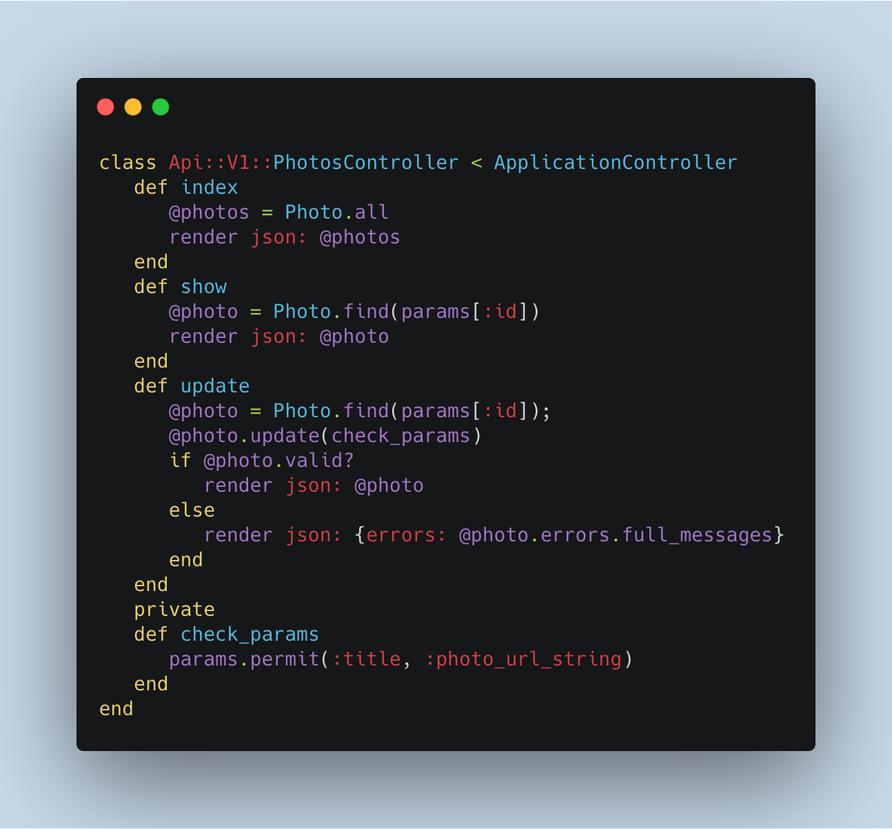 - Method check_params permit các key title và photo_url_string mỗi khi một request PATCH được tạo