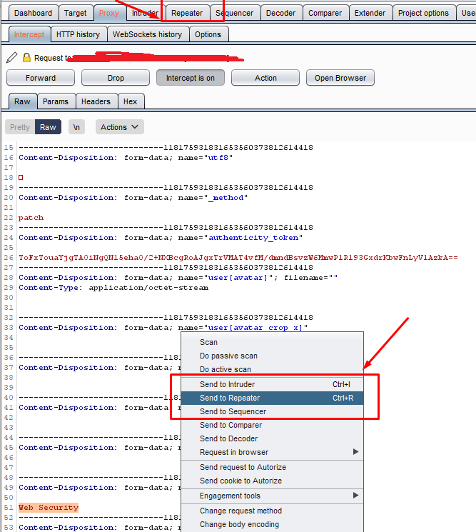 , chắc khá là mệt đây. Vậy bài toán này giải quyết sao??? Rất may burpsuite có thể giúp ban với chức năng Repeater. Chỉ với 1 request hợp lệ được "Intercept is on" sau đó là click chuột phải và "Send to repeater" là các bạn có thể thoải mái test và không cần nhập liệu lại nhiều lần khác nhau.