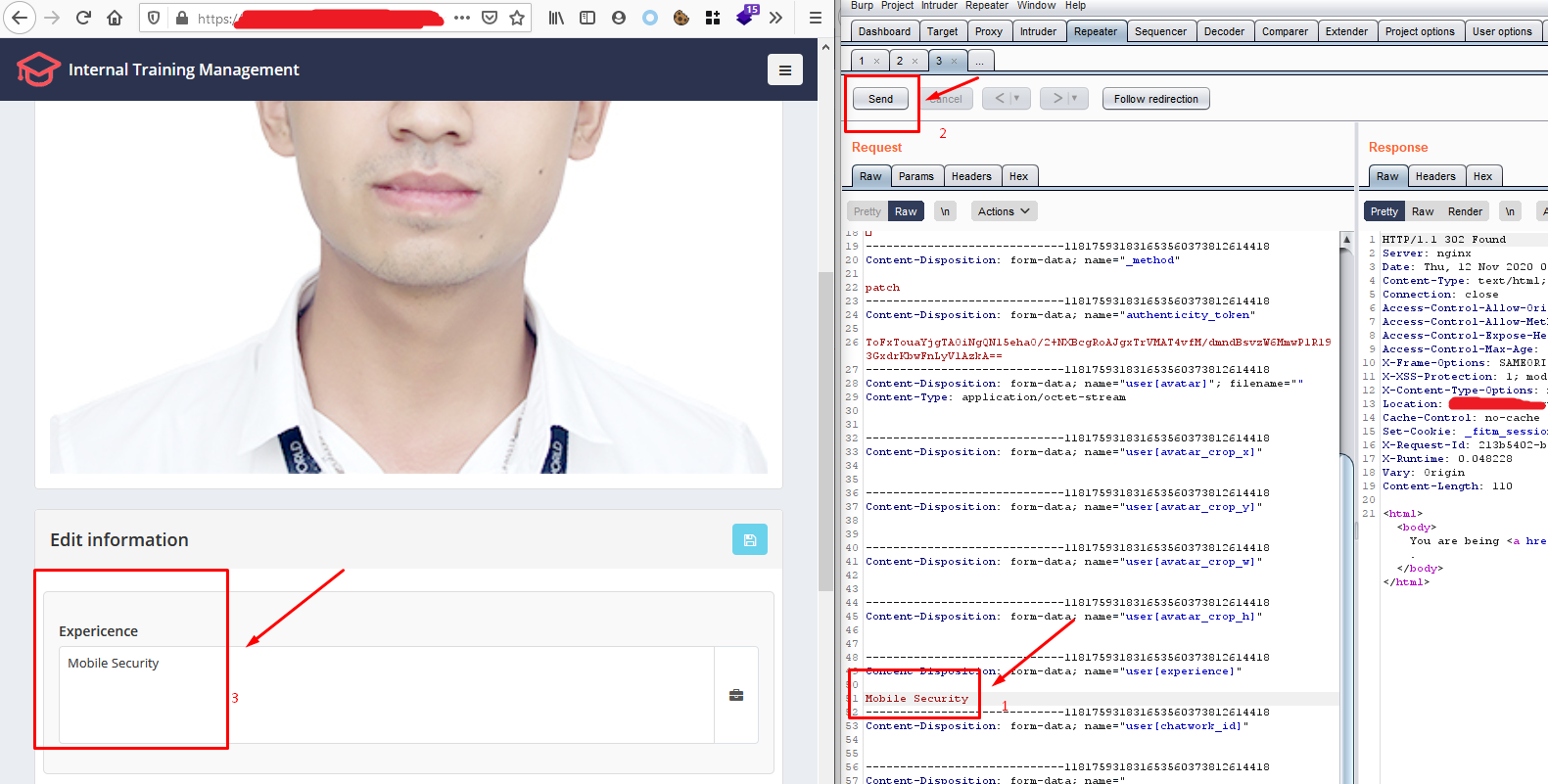 Bước 3: Làm việc trên repeater. Trên tab repeater, mỗi khi bạn nhấn "Send" dữ liệu sẽ được gửi trên server. Các bạn có thể xem luôn response server trả về tại respone cũng như kiểm tra tại trình duyệt. Ở đây mình sửa lại dũ liệu thành "Mobile Security"