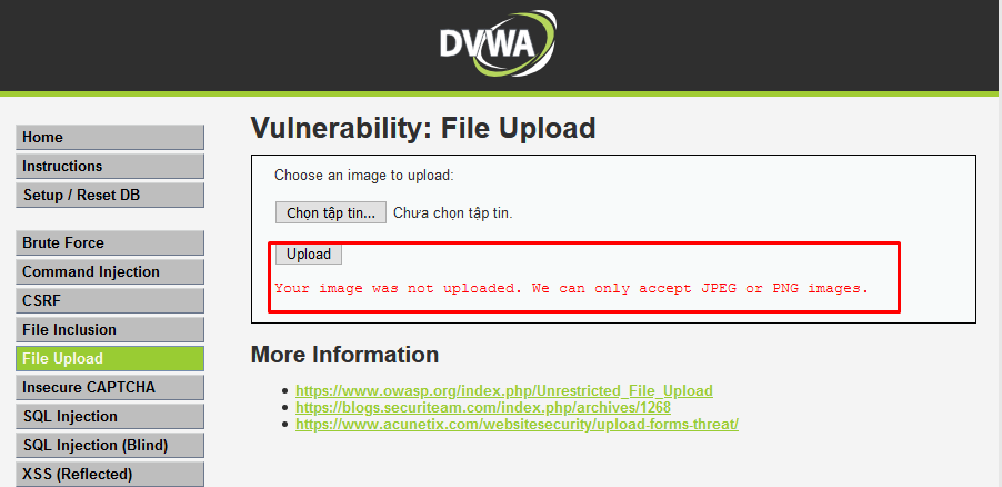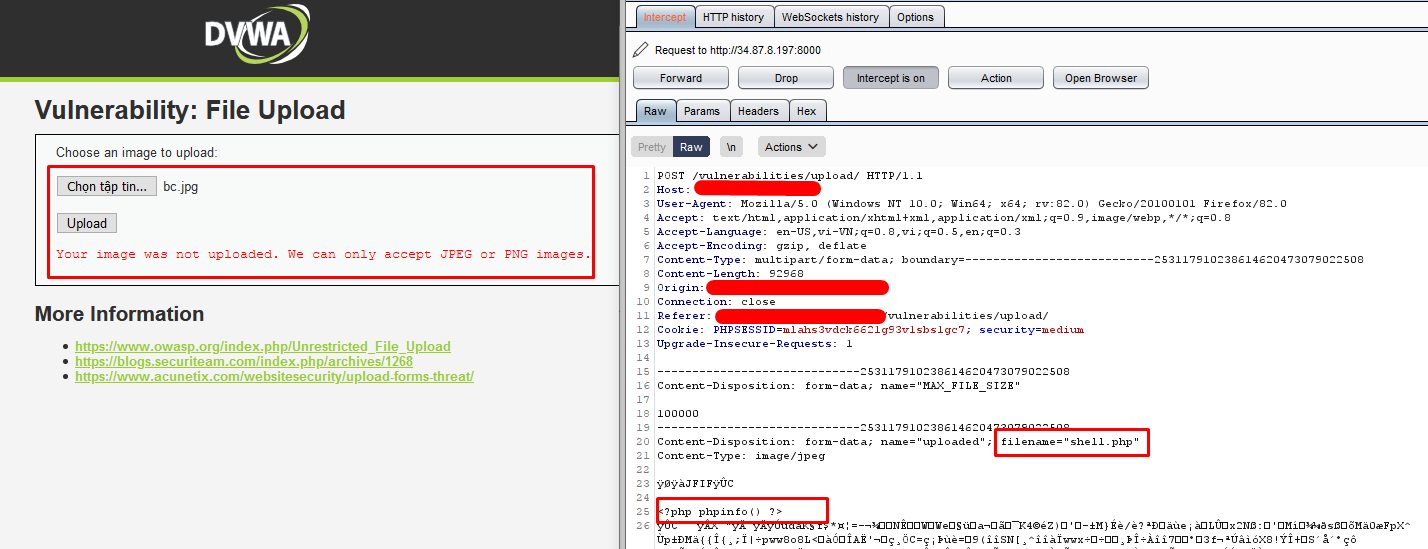 Vậy nếu với website sử dụng Javascript để kiểm tra ở phía client các bạn sẽ làm sao để bypass? Ví dụ client cho bạn nhập 1 số nhưng chặn việc nhập số âm hoặc số quá lớn. Các bạn có thể nhập vào 1 số hợp lệ, tiếp đó chặn bắt lại request và sửa số đó thành số âm hoặc 1 số lớn. Hoặc nếu website có chức năng upload ảnh và sử dụng javascript để kiểm tra đuôi file có phải là .png hay .jpg không. Các bạn chỉ cần up 1 file ảnh hợp lệ rồi sau đó sửa đổi đuôi file sang đuôi mình mong muốn như: .html, .php,..image. Demo bypass chức năng upload file: Chức năng uplaod ảnh chặn upload file php ở phía client Bước 1: Upload 1 file php không thành công