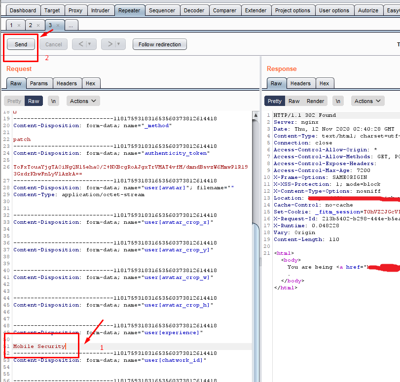 LƯU Ý: Khi chỉnh sử request nếu dữ liệu không đúng sẽ có màu đen các bạn cần điền dữ liệu ở reuqest dưới dạng URL encode trước khi gửi lên server (Sử dụng tổ hợp phím Ctrl + U để encode và Cltr + Shift + U để decode). Ví dụ nhập "Mibile Security" vì có dấu cách nên request sẽ lỗi (Dữ liệu hợp lệ sẽ có màu đỏ, dữ liệu lỗi sẽ có màu đen). Các bạn chỉ cần bôi đen "Mibile Security" rồi sử dụng "Ctrl + U" là ok: