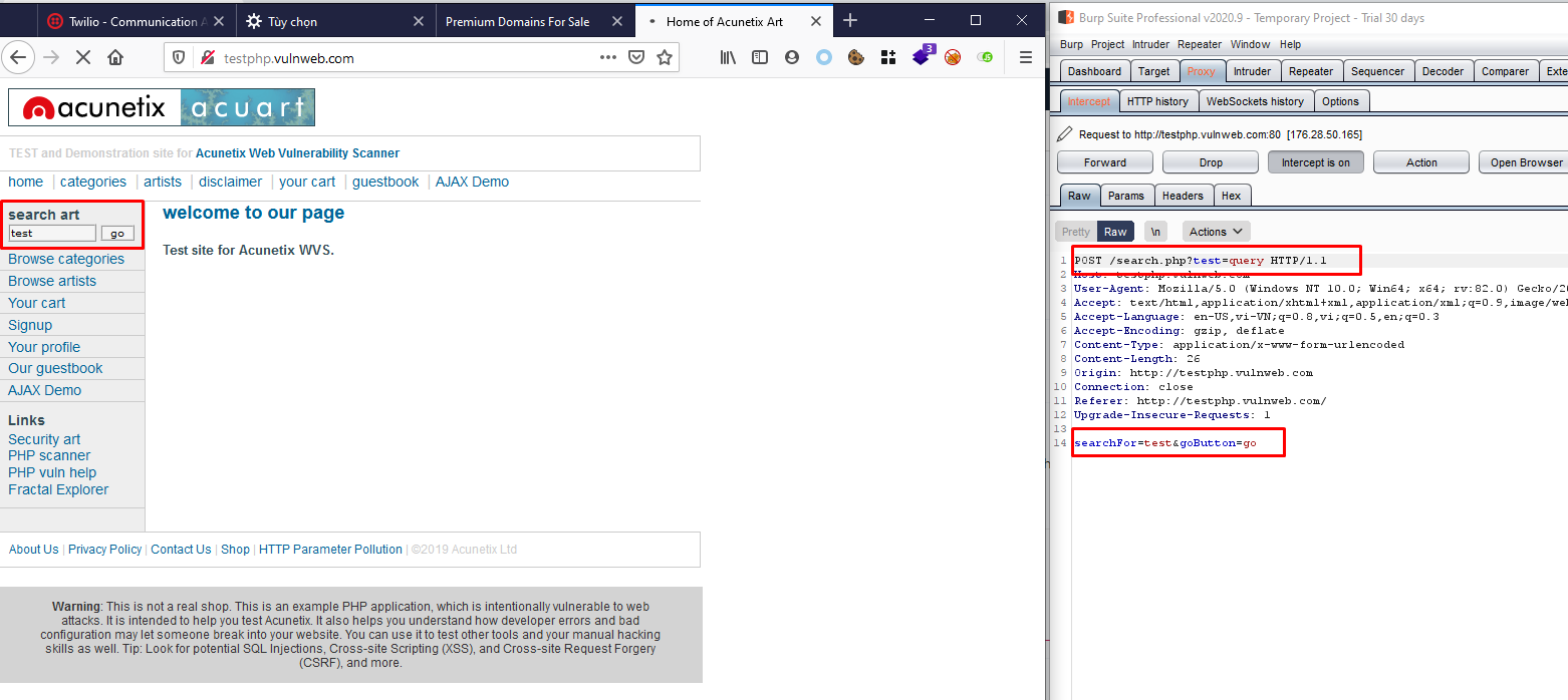 Như mình đã đề cập bài này mình sẽ share những phần trọng tâm và quan trọng sử dụng để test chức năng hay bảo mật. Mình sẽ sử dụng 1 số trang để demo trong đó có http://testphp.vulnweb.com/