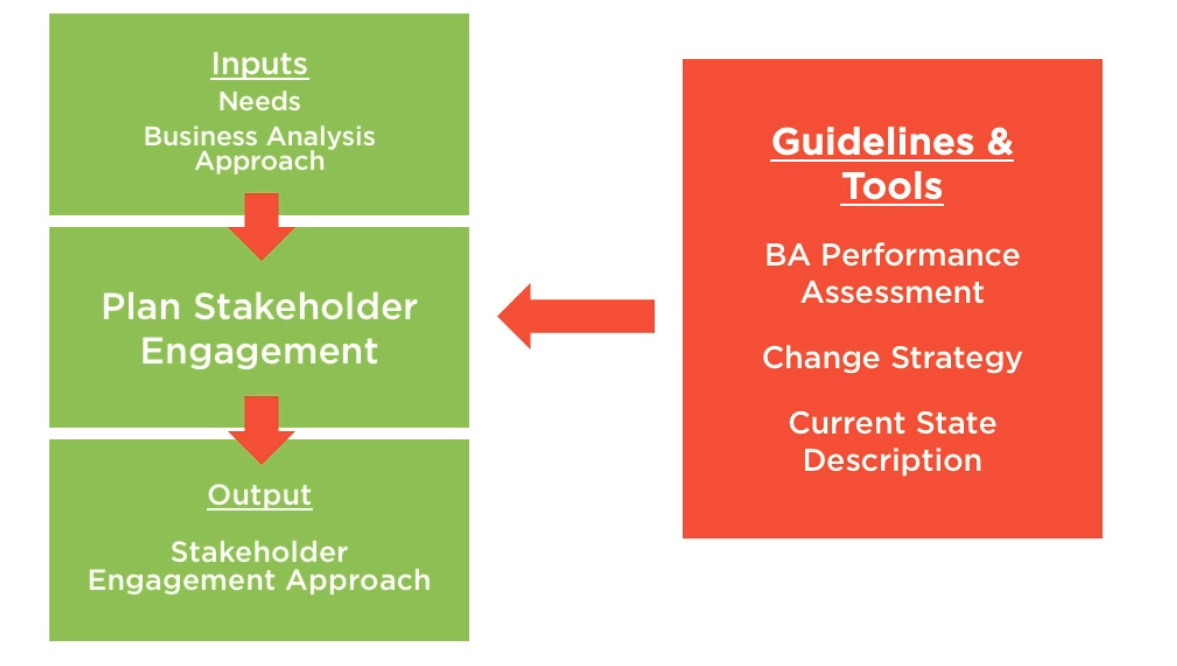 Đầu tiên đó chính là Inputs, chúng ta cần hiểu được nhu cầu nghiệp vụ và những bộ phận của doanh nghiệp, sự ảnh hưởng của nó giúp trong việc mình indentify những stakeholder. Nhu cầu này có thể phát triển khi phân tích những stakeholder được thực hiện. Tiếp theo sau đó là chúng ta cần lên kế hoạch cho việc tham gia giữa các stakeholder, sự hợp tác và giao tiếp với các stakeholder này cũng rất là quan trọng. Để làm được việc này bạn có thể sẽ cần những guildeline và tools như trên hình. Và cuối cùng sau những việc trên là chúng ta sẽ có output cho việc Stakeholder Engagement Approach.