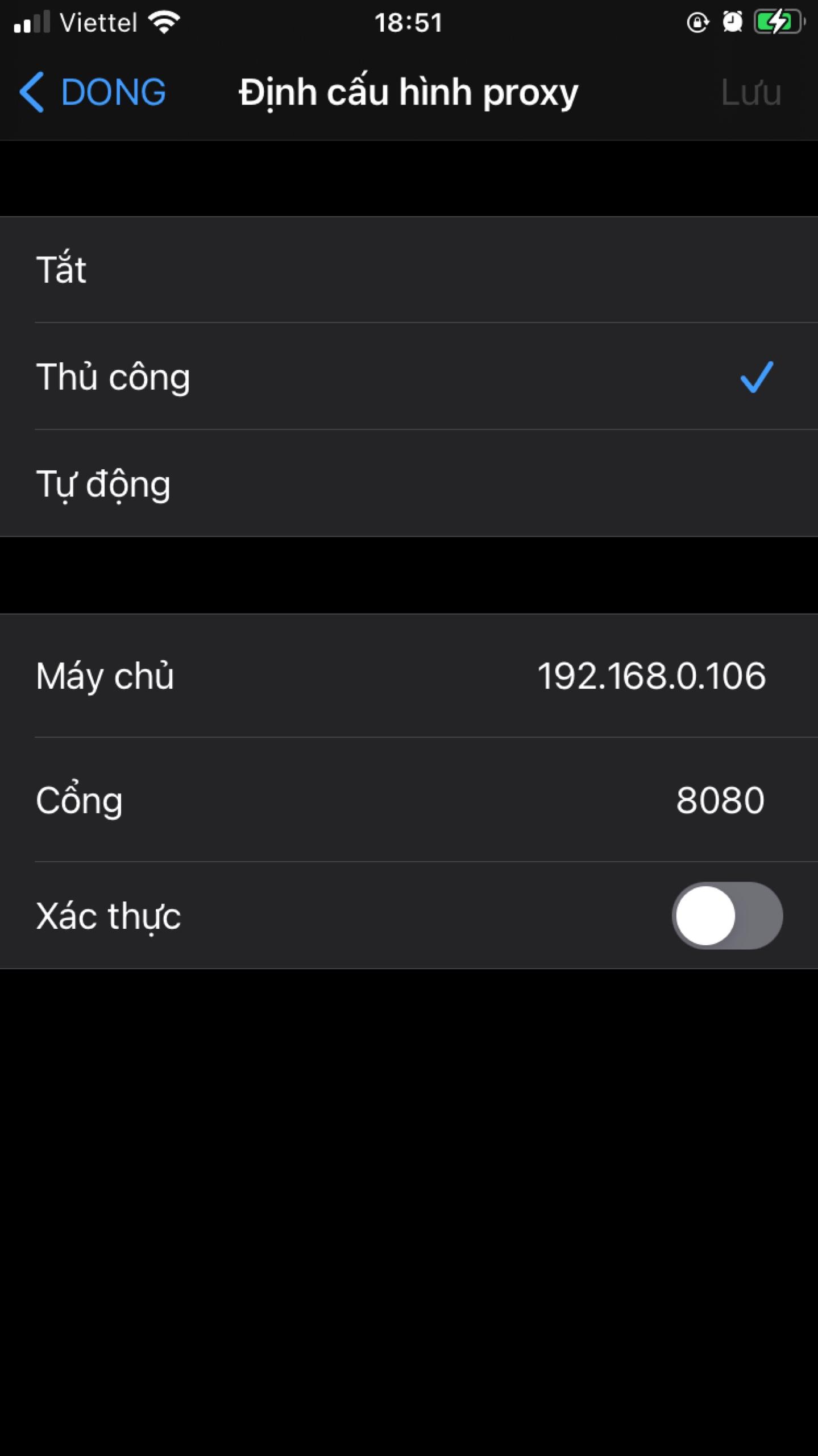 Trên thiết bị iOS, vào cài đặt wifi để thiết lập HTTP Proxy như trên.