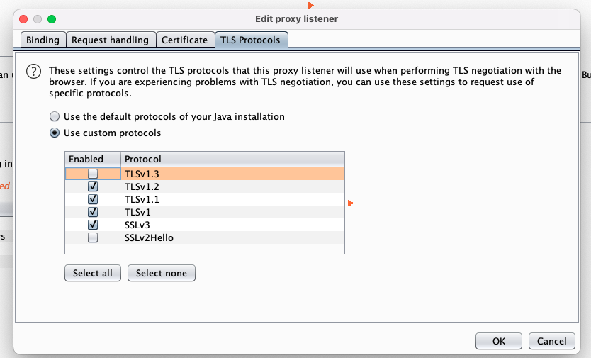 Ở đây, có thể chọn All interfaces hoặc Specific address tùy theo nhu cầu. Với lựa chọn Specific address thì chúng ta sẽ nhập vào địa chỉ của thiết bị iOS trong mạng. Tiếp theo, bên phía TLS Protocol, chúng ta sẽ chọn Use custom protocol và bỏ đi TLS v1.3. Lí do là vì với một số ứng dụng, việc sử dụng giao thức này có thể phát sinh lỗi nên bỏ trước cho chắc ăn.