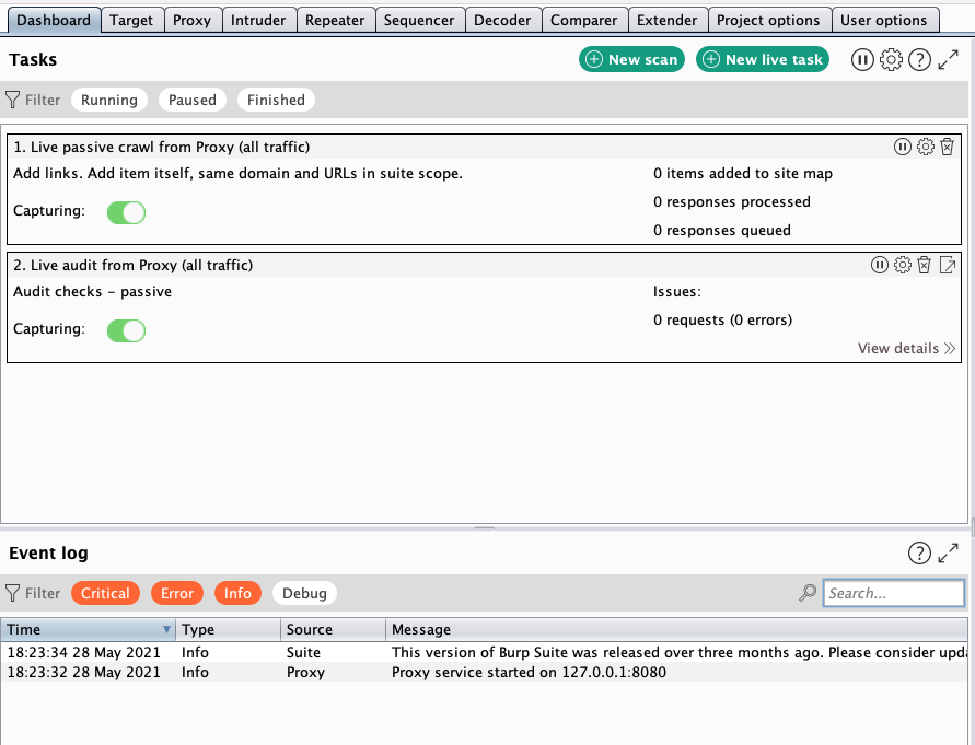 Sau khi đã tải về và cài đặt thành công, chúng ta khởi động Burp Suite lên. Đây là giao diện sau khi chạy ứng dụng