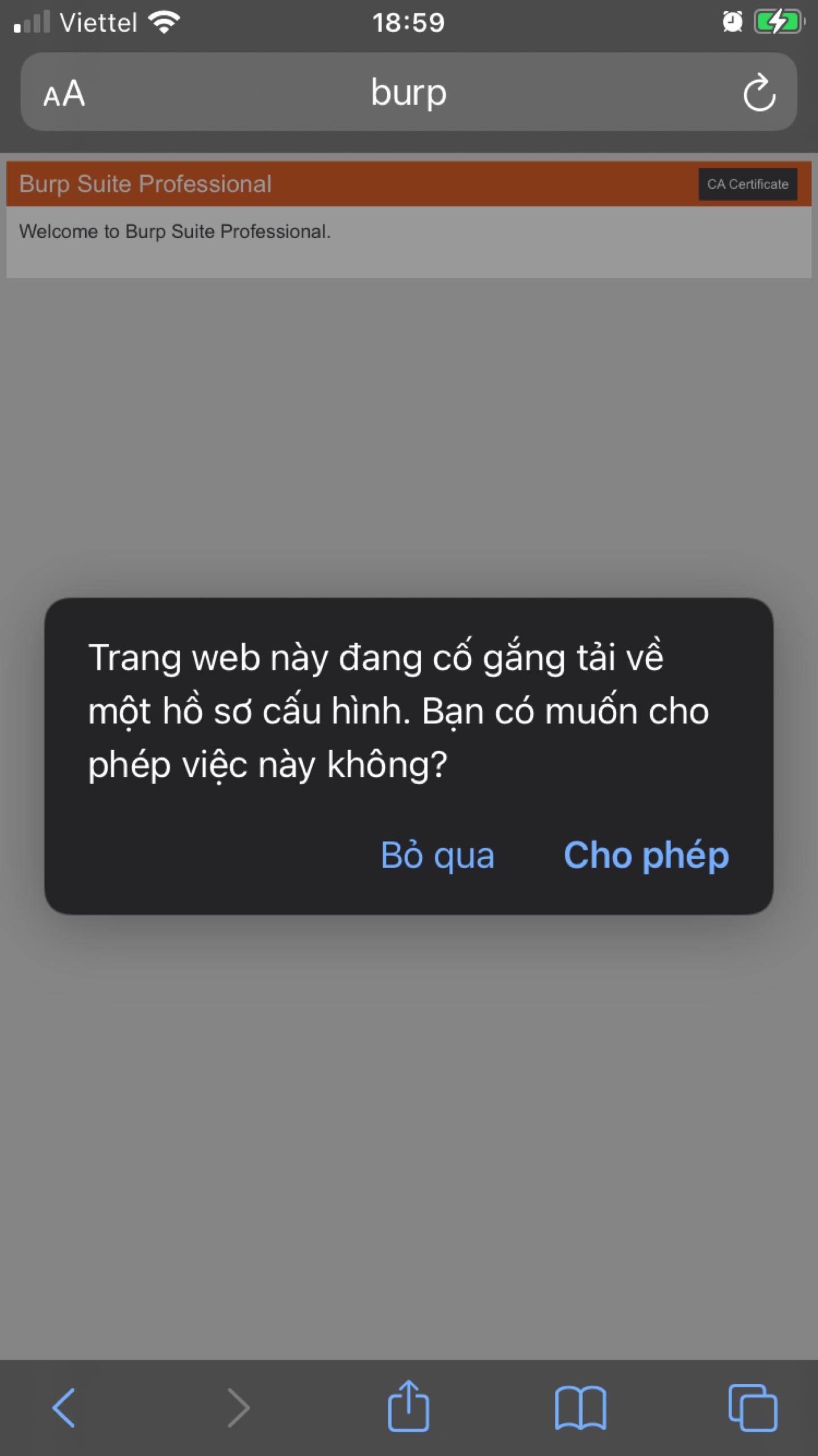 Bây giờ, khi chúng ta đã có kết nối tới các trang http. Tuy nhiên, để có thể gửi các request https, chúng ta cần cài đặt chứng chỉ của proxy lên thiết bị. Với BurpSuite, truy cập tới http://burp bằng safari.